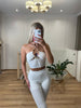 Ensemble en maille pantalon fluide évasée et top à perles. Le pantalon possède une doublure short.