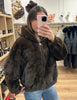 Veste en fourrure marron à capuche, manches longues, dotée d’une fermeture zippée.